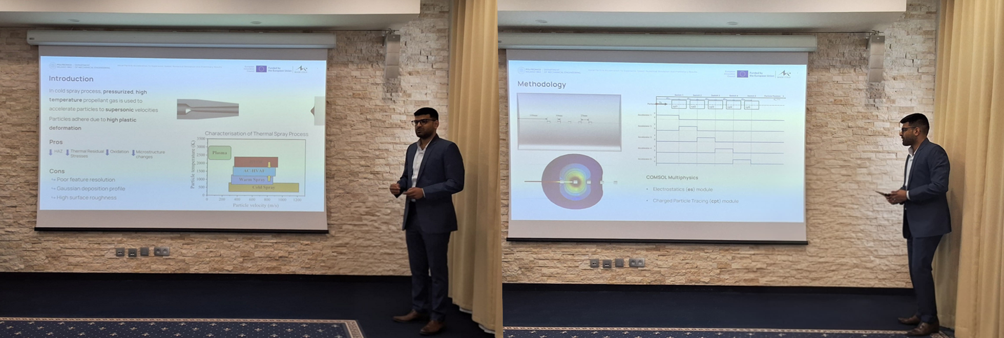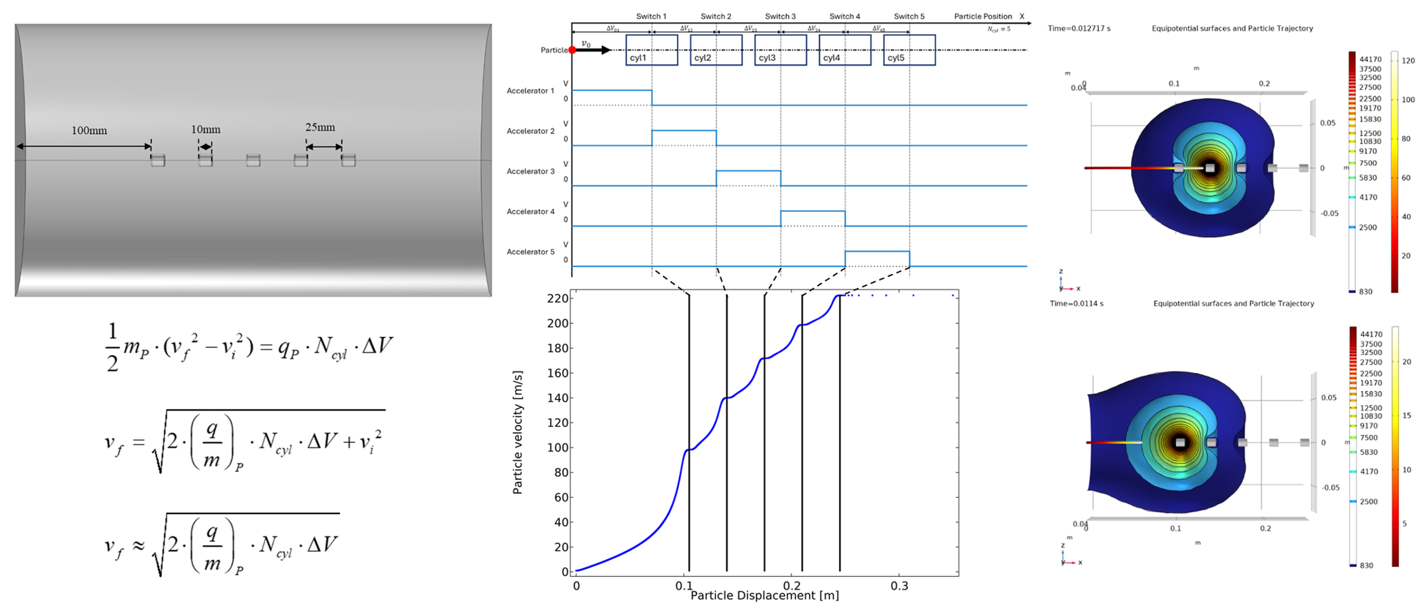 Abstract: Cold spray, because of its solid-state deposition nature retains the original properties of the feedstock to produce oxide-free deposits and not adversely affect underlying substrate material during manufacturing while maintaining high deposition rate. However, deposition accuracy, high operational cost for high velocity requirements, are some of the few limitations that are yet to be addressed. This work explores a novel solid-state deposition principle using a linear accelerator (LINAC) system, inspired by the cold spray process where material deposition and bonding occur through high plastic deformation. The purpose of this study is to validate the concept using numerical simulation model. It includes assessing the influence of applied electric field on charged particle using high voltage cylindrical accelerators. Influence of different parameters on final particle velocity like applied voltage V, number of accelerators N and charge-to-mass ratio q/m are analyzed by simulating model for three different parameter conditions and compared with the formulation. Compared to the conventional cold spray process, this proposed method offers better control over particle velocity and deposition accuracy through electric field modulation, improving resolution for intricate structures.